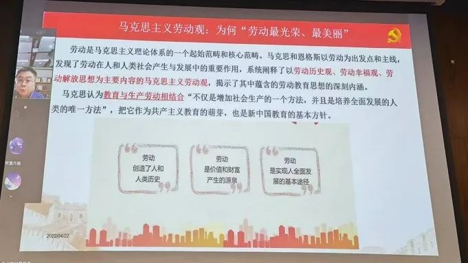 分享过程中,朱贞副教授还重点围绕“马克思主义劳动观”详细讲解。他指出,劳动是马克思主义理论体系的一个起始范畴和核心范畴。马克思和恩格斯以劳动为出发点和主线,发现了劳动在人和人类社会产生与发展中的重要作用,系统阐释了劳动历史观、劳动幸福观、劳动解放思想为主要内容的马克思主义劳动观,揭示了其中蕴含的劳动教育思想的深刻内涵。他还结合中华人民共和国成立以来国家层面对于劳动教育的表述,进一步说明我们党的教育方针不断发展完善,实现了与时俱进。特别是党的十八大以来,习近平总书记高度重视青少年劳动教育,强调“德智体美劳五育并举、全面发展,把劳动教育纳入人才培养全过程,贯通大中小学各学段和家庭、学校、社会各方面”,习近平总书记的重要论述为新时代加强劳动教育提供了根本遵循。