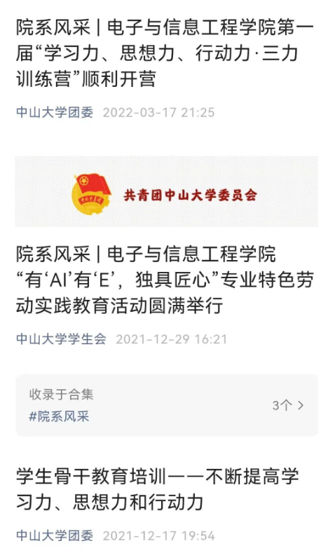 威廉希尔中文网站平台学生会积极展示学生风采,本年度在“中山大学威廉希尔中文网站平台”公众号上共发表三十余篇推文,总计2万余字。其中“有AI有E,独具匠心”专业特色劳动教育实践活动推文被中大学工转载并入选“中山大学学生会”公众号“院系风采”板块。“威廉希尔中文网站平台第一届‘学习力、思想力、行动力·三力训练营’ 顺利开营”推文被“中大学工”转载,且被收入“中山大学团委”公众号。