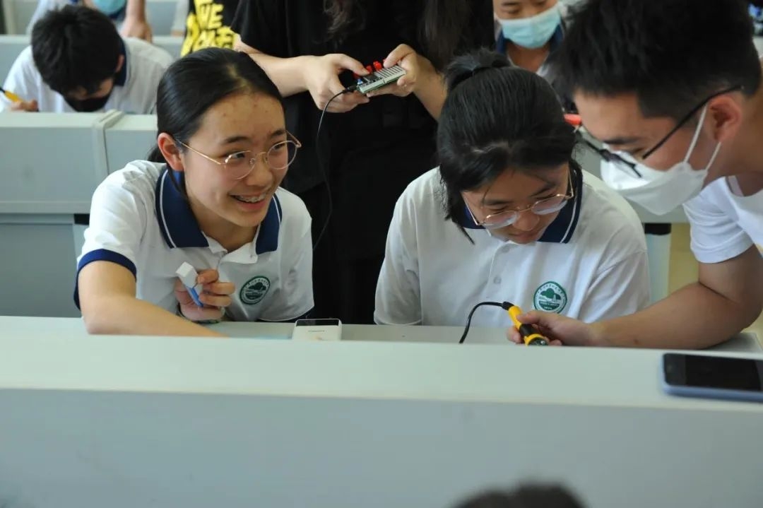 当活动接近尾声时,同学们兴致勃勃地体验自己亲手制作的游戏机。
