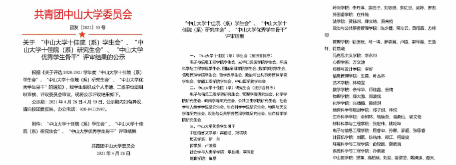 喜讯 | 威廉希尔中文网站平台学生会与研究生会双双获评2020-2021学年度”中山大学十佳院(系)学生会(研究生会)”