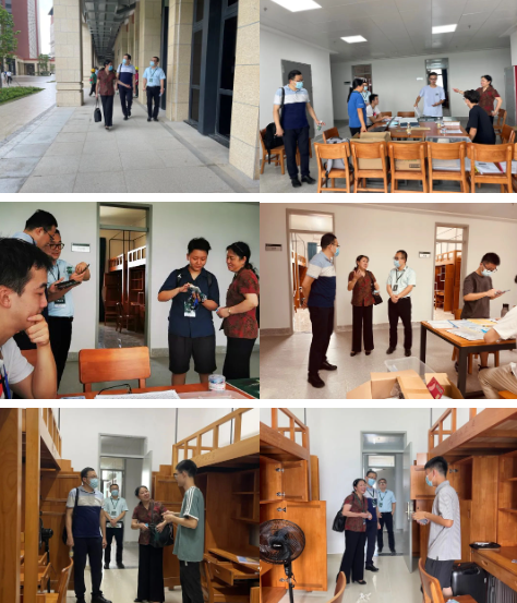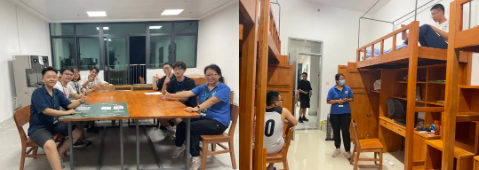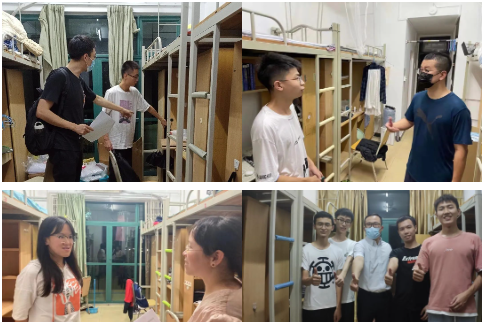 晚上19点,广州校区东校园,学院党委副书记王琅、青年教师专职辅导员王玺钧副教授、李凡副教授、学院团委书记陈子静老师、教务员曾世豪老师,会同迎新志愿者分头逐间走访研究生新生宿舍,查看新生们安顿情况,了解研究生新生困难和需求,表达学院的关心和问候,同时还就疫情防控、宿舍卫生、宿舍消防用电安全和电信诈骗防范等进行督促提醒。