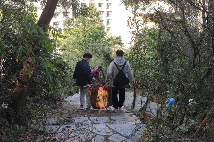 在清理活动中,支部党员们也不断根据实际情况进行分工调整,优化清理流程,努力解决问题。比如,在清理活动前期,大家发现负责搬运枯枝杂草上下山的同志总是满头大汗,就会进行轮换清理和搬运,最后女同志们也一起加入搬运队列,共同完成艰难的搬运工作。再比如,在活动后期,大家发现枯枝杂草基本已被清理并堆积好,但由于箩筐数量较少,搬运上下山以及等待垃圾车的时间较久,效率较低。这时,大家开始集思广益,有的同志主动挑出较大的树枝,直接双手抱住搬下山,有的同志则从别处找来废弃的蚊帐、被套等,一次性装走了好几个箩筐才能装下的枯枝杂草,从而大大提高了搬运效率。