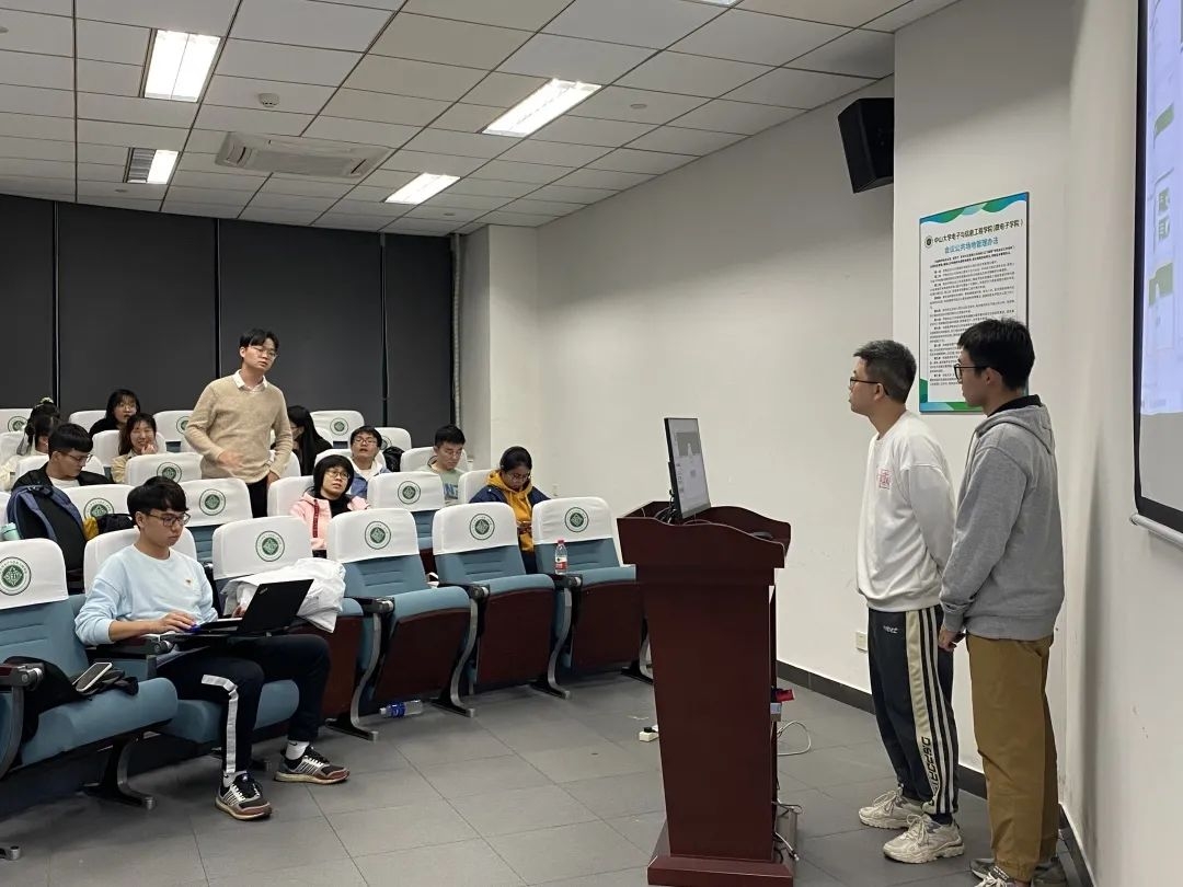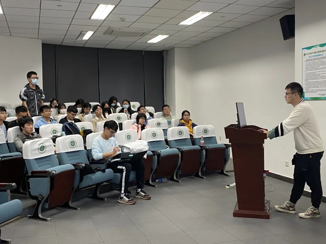 最后由牟炳叡同志和周燕贤同志进行学科竞赛的介绍。牟炳叡同志本科专业是电子信息科学与技术专业,获得过全国电子设计竞赛国家二等奖、全国大学生机器人大赛南部赛区三等奖等奖项。牟炳叡同志针对电设竞赛进行基本情况的介绍、赛题分析、如何组建队伍、如何获取资源等问题展开讲解。期间强调与他人组队时需要保持团结,不断从失败中前进,才能收获成功,以及坚持友谊第一的原则。周燕贤同志本科专业为微电子科学与技术,曾获得全国大学生集成电路创新创业大赛全国一等奖、中山大学2021届优秀本科毕业生等荣誉。周燕贤针对全国大学生集成电路创新创业大赛进行介绍,包含大赛特点、规模、日程安排、赛事内容,以及个人比赛经验进行讲解。强调学习比比赛要重要,要学有余力、量力而行,不要为了比赛落下学习,切实把专业基础打牢。