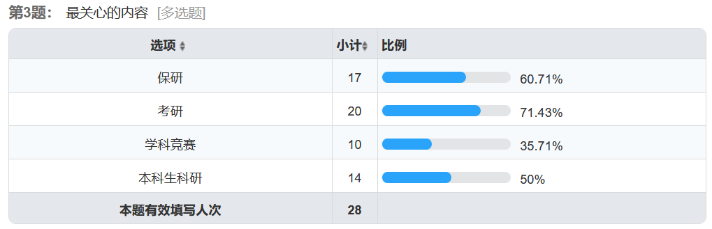 活动正式开始前,支部同志们以问卷形式进行了初步调研。问卷收集了同学们感兴趣的话题及目前对自己学业发展的疑虑。支部各位同志利用课余时间分析了问卷结果,从而更有针对性地设计自己分享的内容。