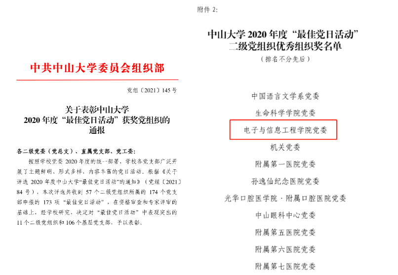 为深入贯彻落实习近平新时代中国特色社会主义思想和党的十九届五中全会精神,坚持“党的一切工作到支部”鲜明导向,全面提升党支部组织力、凝聚力、战斗力,以优异的成绩迎接建党100周年,学校于2021年开展了2020年度中山大学“最佳党日活动”评选工作。学院党委积极组织,师生党支部踊跃申报,经支部报送、学院党委推荐、学校党委评选等环节,威廉希尔中文网站平台教职工第一党支部、教职工第五党支部、硕士电子A班第一党支部、博士第一党支部申报项目获评“最佳党日活动”,威廉希尔中文网站平台党委也荣获“优秀组织奖”。
