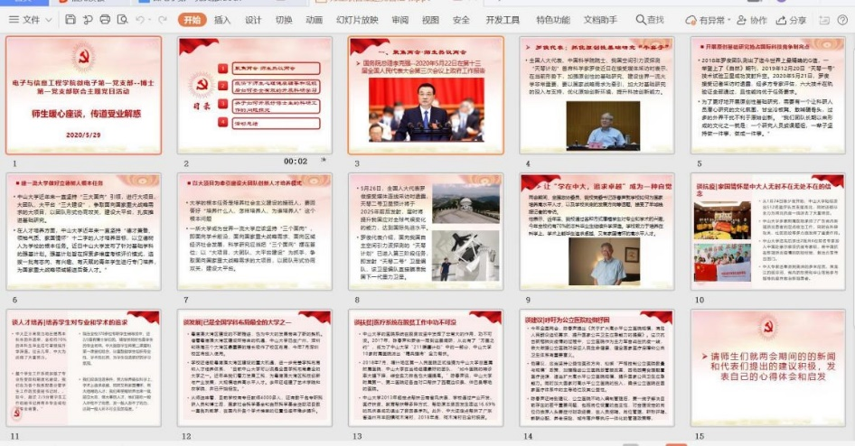 2020年初新冠肺炎疫情暴发,许多同学未能返校只能居家学习,特别是对于博士研究生,很可能由于耽搁了科研工作时间而使得实验任务无法及时完成,进而导致心理上焦虑和不安情绪产生。为更好地缓解同学们的焦虑情绪,2020年5月29日,由学院党委牵头,教职工第一党支部联合博士第一党支部通过线上方式联合开展了“师生暖心连线,传道授业解惑”主题党日活动。