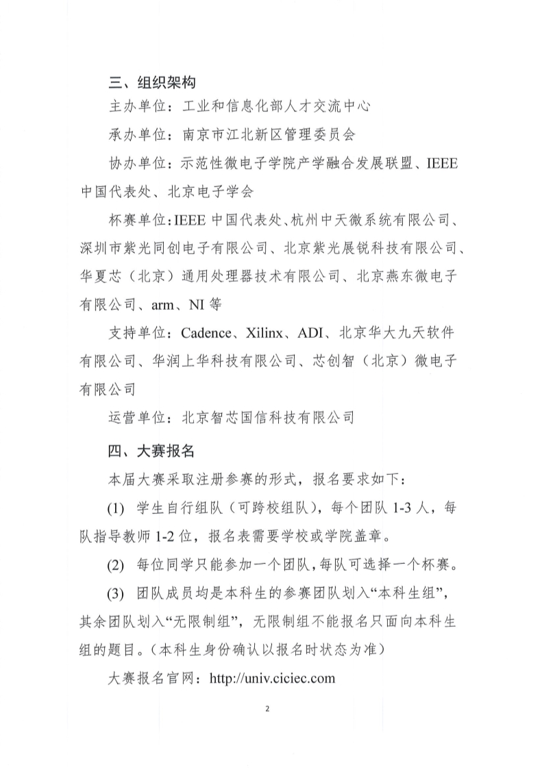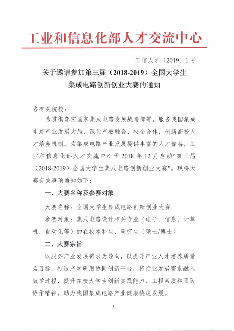 导航痕迹 首页 学生工作 学工通知 第三届全国大学生集成电路创新创业大赛参赛通知 94 Share 第三届全国大学生集成电路创新创业大赛参赛通知 发布日期:2019-03-07 各年级, 现转发第三届全国大学生集成电路创新创业大赛参赛通知及大赛章程,感兴趣的同学可按照流程报名参加, 比赛报名将于3月16号截止。 大赛官网:http://univ.ciciec.com 附件 关于邀请参加第三届全国大学生集成电路创新创业大赛的通知.PDF 第三届全国大学生集成电路创新创业大赛章程.pdf