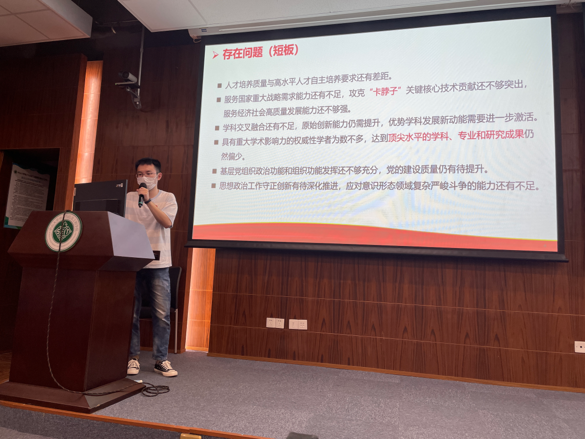 支部书记彭琢雅同志传达学习了学校党委书记陈春声在中国共产党中山大学第十四次代表大会上的报告的重要精神。中国共产党中山大学第十四次代表大会,是我们在党的二十大胜利召开、加快建设中国特色、世界一流大学的关键时刻召开的一次十分重要的大会。在党的全面领导下,学校在政治建设、人才自主培养能力、学术创新能力、教师队伍建设、社会服务、服务保障支撑能力、基层组织政治功能、守正创新能力等方面显著提升,文理医工农艺综合发展学科格局、政治生态持续净化等方面持续优化。中山大学即将迎来百年校庆。我们要弘扬百年中大精神,赓续优良办学传统,深刻把握历史主动,凝聚师生校友力量,在中大新百年新征程上,努力开创服务党和国家事业发展的新局面,为高等教育发展贡献中大智慧和力量!