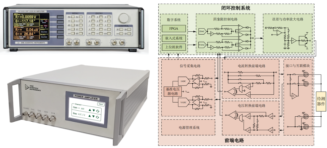 图5 精密检测仪器研究成果:锁相放大器及多通道超声高速收发系统实物图(左);高精度数字源表系统框图