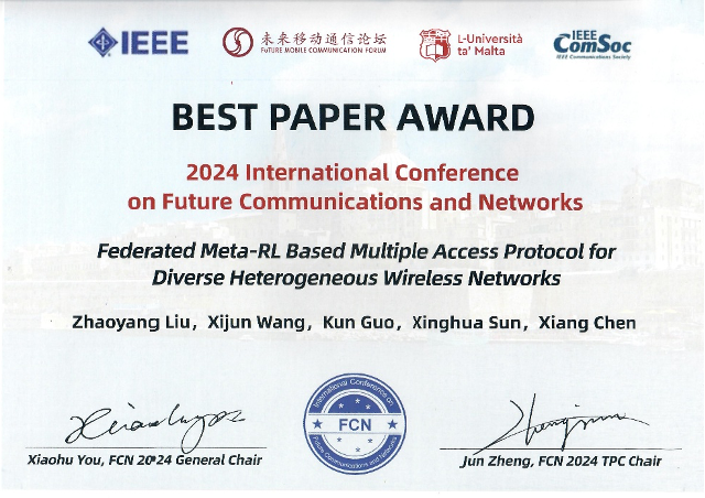 20241118日至22日,第二届未来通信和网络国际会议(FCN2024)在马耳他瓦莱塔成功举行。本次大会由未来移动通信论坛与马耳他大学联合主办,并得到IEEE的技术支持,吸引了来自15个国家和地区的60余所顶尖高等院校、研究机构和企业的专家学者参与。会议覆盖了AI驱动的通信与网络、边缘与云计算、移动无线通信与网络、下一代网络与互联网、以及空天地多域通信等前沿科研方向。威廉希尔中文网站平台王玺钧副教授指导的博士生刘昭炀同学的研究成果“Federated Meta-RL Based Multiple Access Protocol for Diverse Heterogeneous Wireless Networks”荣获最佳论文奖。威廉希尔中文网站平台陈翔教授、华东师范大学郭坤研究员以及中山大学电子与通信工程学院孙兴华副教授为合作作者。