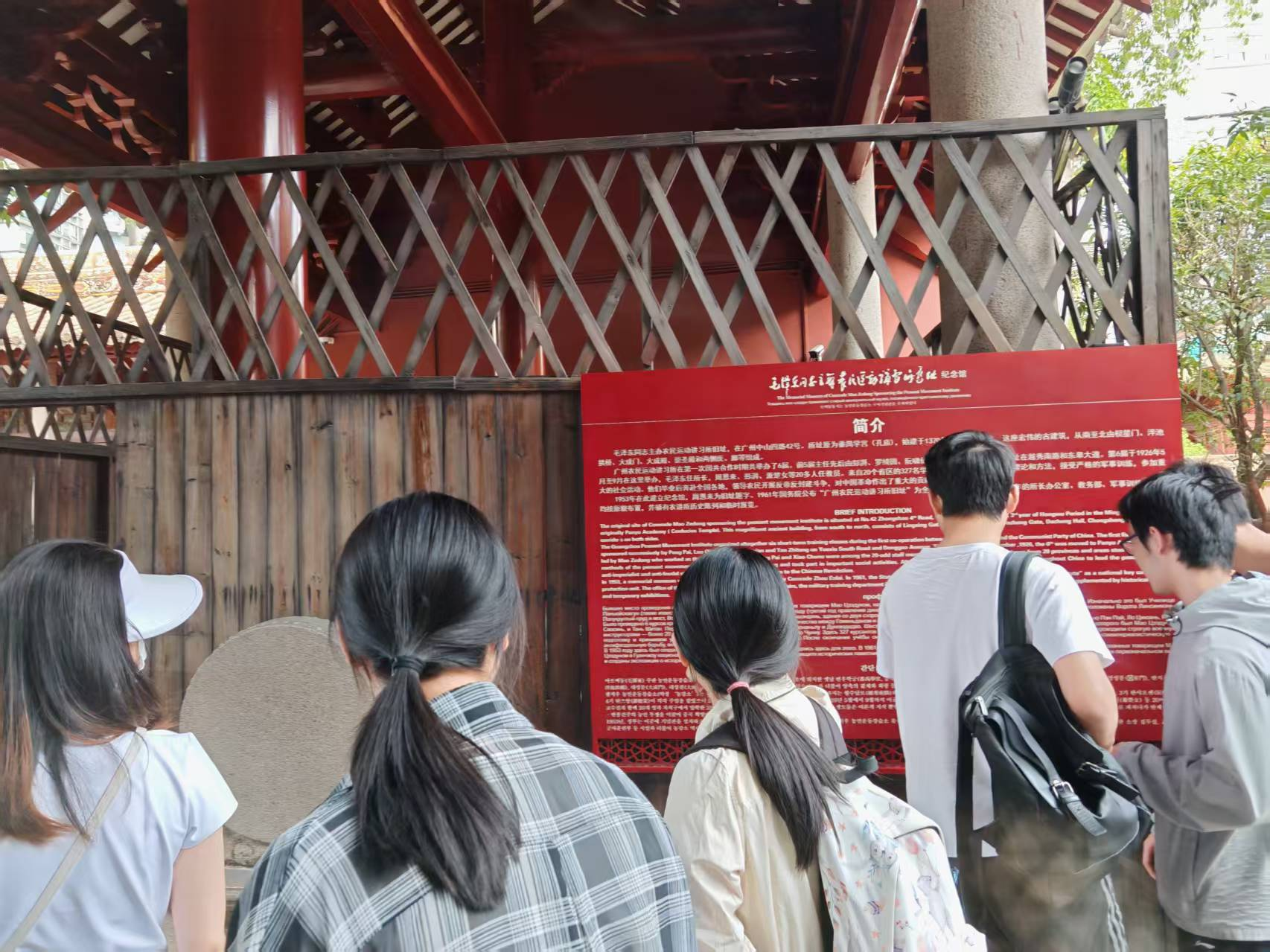 在参观中,师生们仔细了解农讲所学员所学习的各项科目。1926年7月,为激励国民革命军北伐誓师,黄埔军校教官编曲填词,诞生了《国民革命歌》。该曲也是农讲所学员在军事训练中学唱的歌曲。活动中,讲解员带领全体师生齐唱《国民革命歌》——“打倒列强,打倒列强;除军阀,除军阀;努力国民革命,努力国民革命;齐奋斗,齐奋斗!”重温当年北伐军誓师的铿锵豪情。歌声中,师生们不仅感受到革命先辈用音乐动员群众、鼓舞斗志的智慧与热忱,也凝聚起传承不息的奋斗力量。